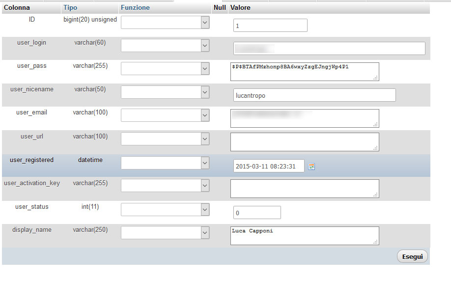 Nella colonna destra della voce "user_pass" sostituisci il valore presente con la nuova password da te scelta e seleziona nella corrispettiva casella funzione il protocollo MD5 che cripterà la tua password per non renderla visibile.